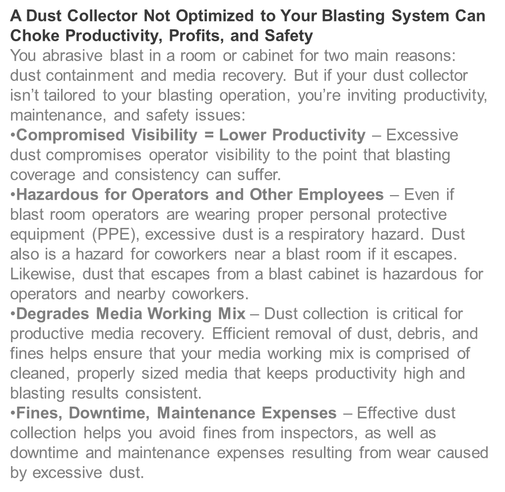 Dust collection system is designed specifically for air-blast applications. An Empire collector comes outfitted with a properly sized high pressure blower. Every feature has been engineered for optimal performance in this tough high demand environment. The system captures the dust laden air, filters it and returns clean air to the plant.